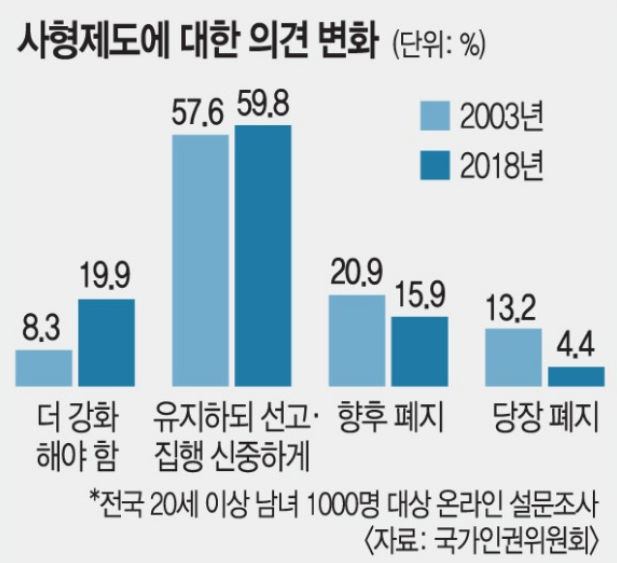 而且,2000年初以后,死刑的判决基准更加严格,除非是像姜浩顺(音译)这样的连环杀人犯或金东民(音译)一样杀害多数人的杀人犯,原则上杀害3名以上,且只有在被杀害人是儿童、杀人手法残忍、性暴力或随机杀人(无差别杀人),犯罪性质极其凶残的情况下才会判处死刑。