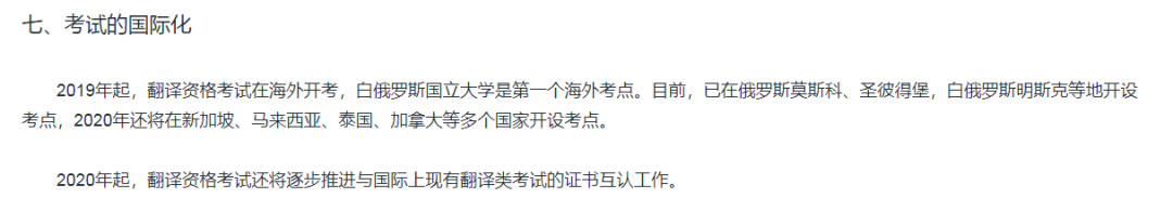 )翻译资格证书已成为评价翻译人才水平的“国家标准”,是众多机关、企事业单位,尤其是大型翻译公司招聘翻译人员的必备证书。翻译资格考试是全球最大的翻译类考试,是我国第一个在海外设立考点的职业资格考试,与国际上现有翻译类考试证书推进互认。